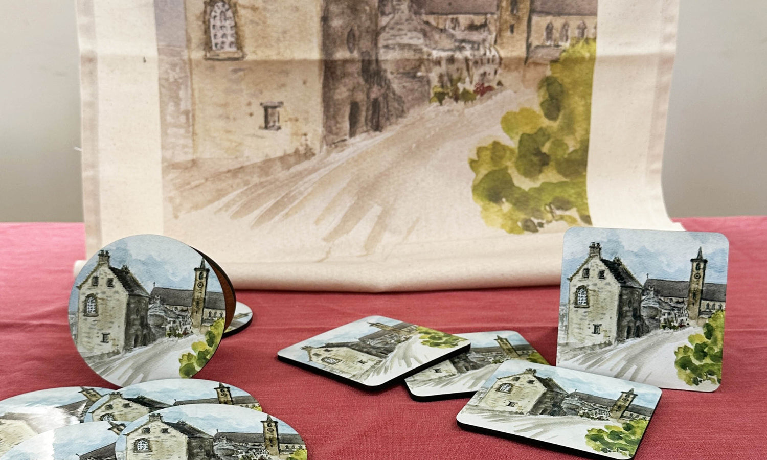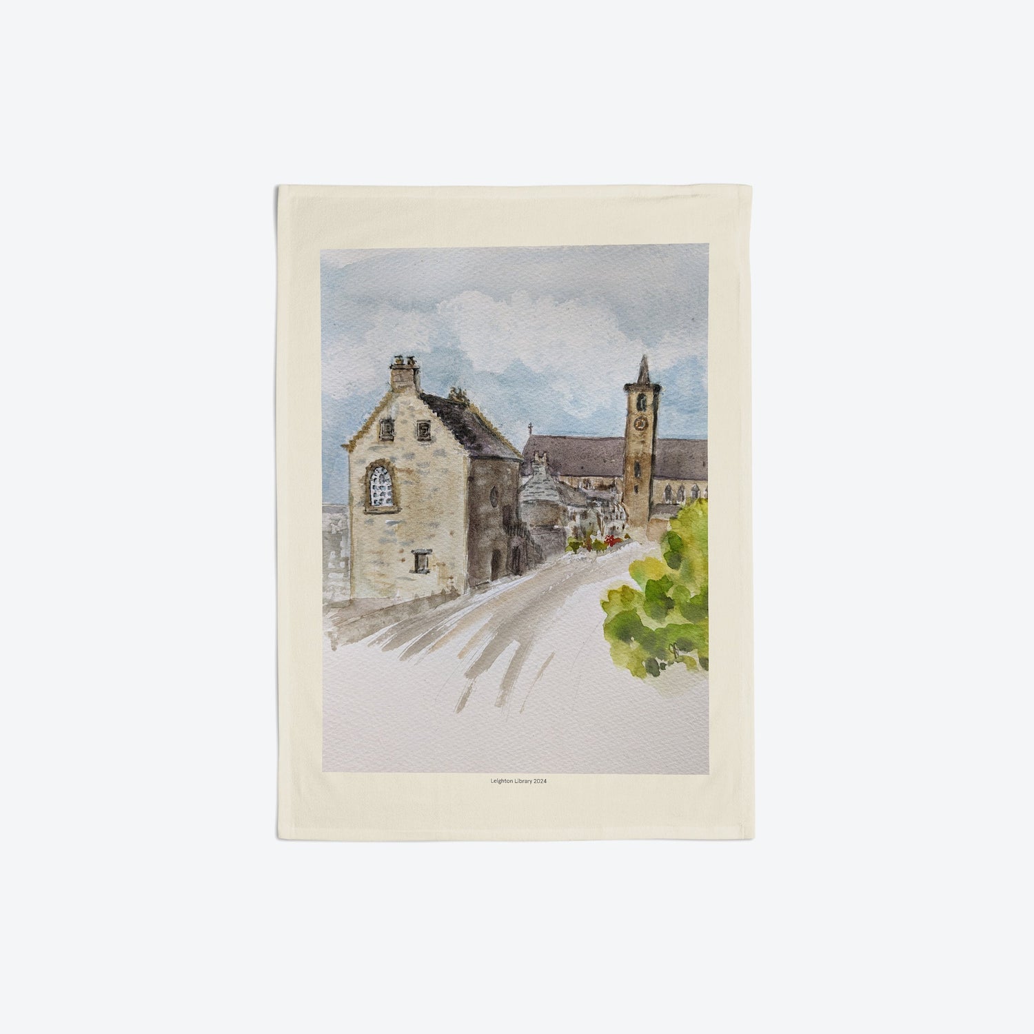Tea towel featuring a lovely watercolour of the library after restoration, painted by artist Jane Dunbar in 2024.
